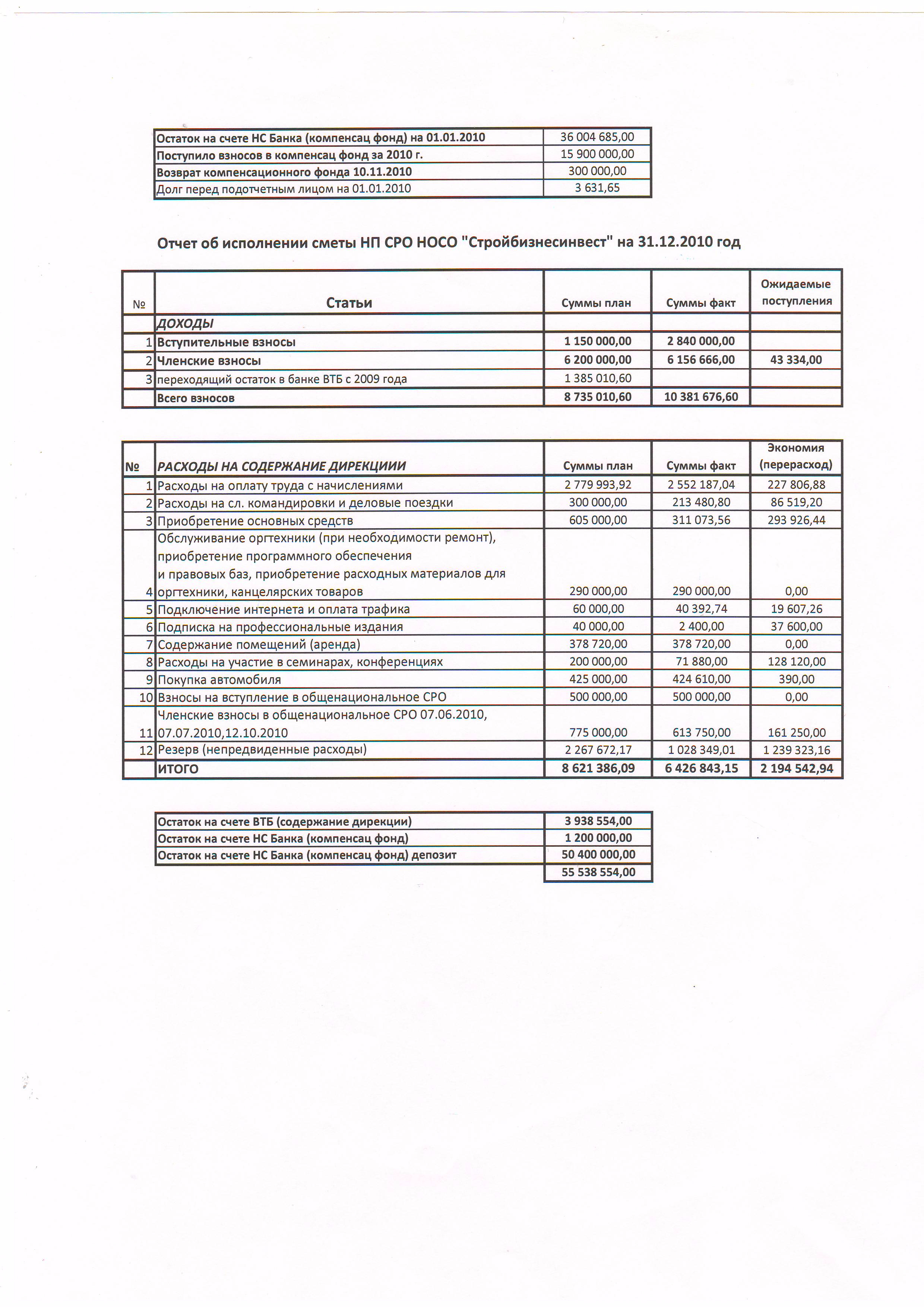 Исполнение сметы 2010 года